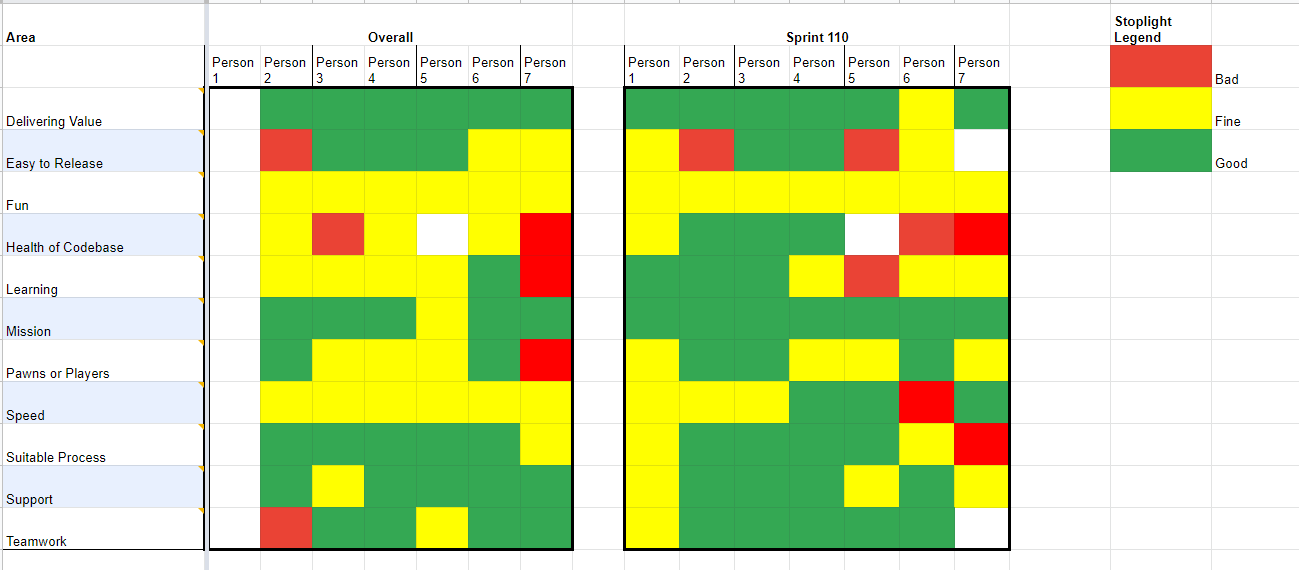 My team has started to use the Spotify Healthcheck retrospective with some great results. Here's the template (Google Cheets) I've created to help other teams take advantage of this great reflection tool.